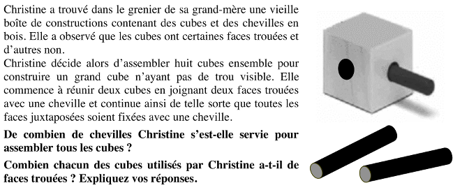 La tâche suivante peut se dérouler dans le cadre arithmétique : Chacun des huit petits cubes a trois faces en contact avec des autres, ce qui donne 24 (3 × 8) trous à relier deux à deux par 12 chevilles (24 : 2).