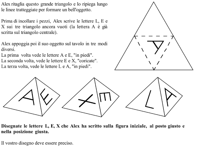 Le quattro facce di un tetraedro regolare sono decorate con le lettere A – L – E – X , visibili su tre fotografie prese da punti di vista differenti; completare uno sviluppo di questo tetraedro sul quale una lettera è già disegnata.