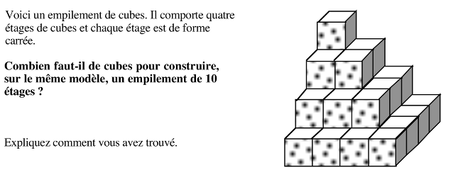 Parmi les erreurs (15%) on trouve celle « classique » consistant à considérer la suite des somme partielles des carrés comme proportionnelle à celle des nombres naturels (numéros des empilements). On calcule la somme des cinq premiers étages : 1 + 4 + 9 + 16 + 25 = 55, puis on double pour arriver à la tour de 10 étages, ou on ne tient compte que de la suite des cubes visibles pour s’apercevoir qu’il y en a 1 au premier étage dès le haut, 4 (1 + 3) pour les deux premiers, 9 (1 + 3 + 5) pour les trois premiers et 100 (1 + 3 + 5 + … + 10) pour les dix étages de la construction demandée.