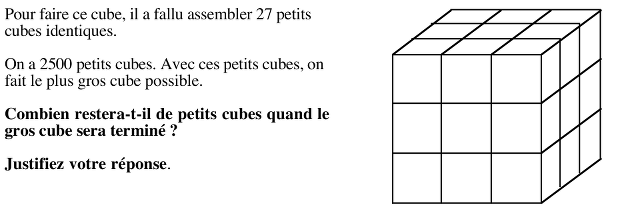 Trouver combien il restera de petits cubes après avoir construit le plus grand cube possible avec 2500 petits cube identiques à disposition (précédé d’un exemple d’un cube construit avec 27 petits cubes)