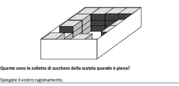 Osservare l’illustrazione di una scatola a forma di parallelepipedo rettangolo contenente solo alcuni parallelepipedi (zollette di zucchero). Determinare quanti parallelepipedi tutti uguali può contenere la scatola quando è piena.