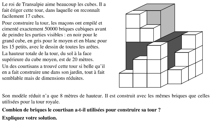 Comme on peut placer 5 petits cubes dans la hauteur de la tour, celle-ci (20 mètres) correspond alors à celle de 50 briques, ce qui permet de calculer la mesure de l’arête d’une brique : 20 : 50 = 0,4 (en mètres).