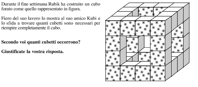 Trovare quanti cubetti bisogna aggiungere ad una costruzione dove sono presenti solamente i cubetti che costituiscono gli spigoli (cubo forato). La costruzione deve essere un cubo di spigolo 4.
