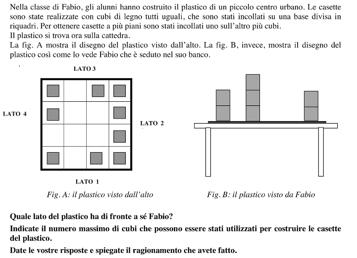 Capire quale lato del plastico ha di fronte a sé Fabio facendo riferimento alla Fig. A. Osservare il plastico mettendosi ogni volta di fronte a ciascuno dei suoi lati, confrontando ciò che si immagina di poter vedere con ciò che è disegnato in Fig. B. Oppure è possibile ruotare il foglio in modo da guardare il plastico di Fig. A avendo di fronte ogni volta uno dei lati. Dedurre che Fabio non può aver di fronte il LATO 1 del plastico, perché altrimenti in Fig. B le case affiancate dovrebbero essere a destra e non a sinistra; non può avere di fronte il LATO 4, né il LATO 2, perché altrimenti vedrebbe una casa anche nello spazio vuoto di Fig. B. Rendersi conto che solo dal LATO 3 Fabio può vedere il plastico così come appare nel disegno di Fig. B.