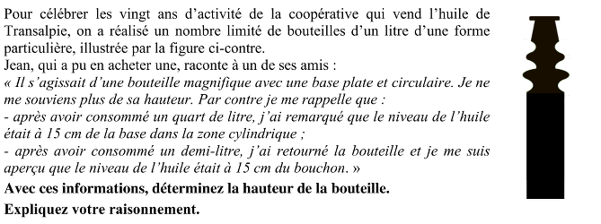 Ou bien, comprendre que la clé du problème est que lorsqu’on renverse la bouteille, la moitié de l'huile se trouve à 15 cm du haut et l’autre moitié à 10 cm du bas, d’où la hauteur totale de la bouteille égale à 25 cm.