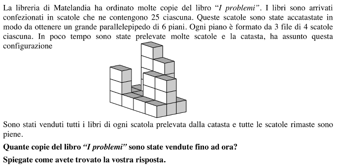 Alcune scatole contenenti ciascuna 25 libri sono state accatastate a forma di parallelepipedo rettangolo con misure 6x3x4 scatole. Osservando il disegno contare le scatole avanzate, dopo che ne sono state prelevate alcune. Determinare infine il numero di libri venduti