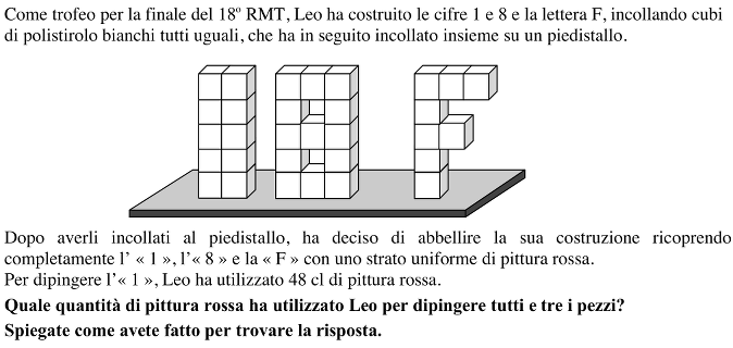 Determinare la quantità di pittura da usare per dipingere le figure , che rappresentano le cifre 1 e 8 e la lettera F, costituite da cubetti tutti uguali e di cui si conosce la quantità di pittura utilizzata per dipingere la cifra 1 .
