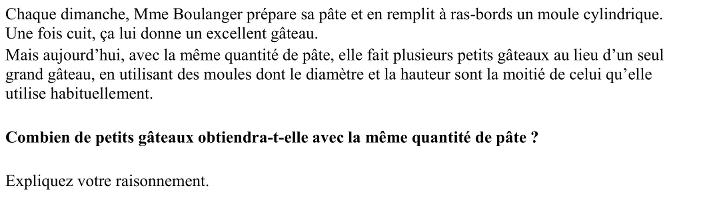 - Comprendre que les moules correspondent à des cylindres de volumes différents et que la somme des volumes des petits cylindres(V1) doit être égale au volume du grand cylindre(V2)