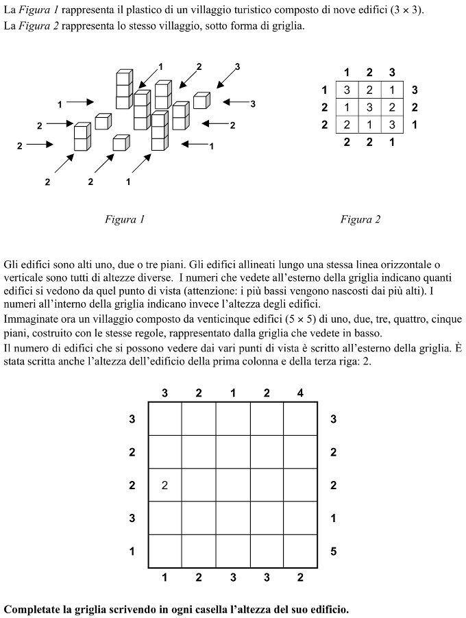 Leggere attentamente le regole del gioco logico (chiamato “Sudoku-city” o “grattacieli”) e verificarle sull’esempio dato passando dalla rappresentazione spaziale alla griglia.