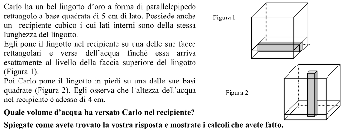 - Comprendere che la lunghezza del lingotto è superiore a 5 cm e procedere per tentativi numerici confrontando i volumi dell’acqua nelle due posizioni.