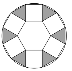 Une figure composée d’un hexagone régulier central prolongé par des carrés sur chacun de ses côtés (patron d’un prisme droit à base hexagonale) est inscrite dans un disque. Déterminer si l’aire de la partie du disque non occupée par la figure est supérieure ou inférieure à celle de l’hexagone.