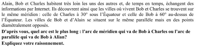 - L’arc de méridien qui va de Bob à Charles est un quart de circonférence de rayon R et l’arc de parallèle qui va de Bob à Alain est une demi-circonférence de rayon R/2. En déduire que la longueur des deux arcs est la même.