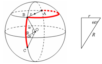 B et C deux points d'une sphère se trouvent sur le même méridien : C à 30° sous l’Équateur et B à 60° au-dessus de l’Équateur. B et A se situent sur le même parallèle mais en des points diamétralement opposés. Comparer les longueurs de l’arc de méridien qui va de B à C et de l’arc de parallèle qui va de B à A.