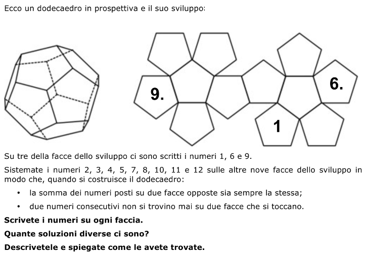 Sistemare i numeri da 1 a 12 sui pentagoni dello sviluppo di un dodecaedro in modo tale che, quando il dodecaedro è costruito, la somma dei numeri sistemati sulle facce opposte sia sempre la stessa e che due numeri consecutivi non siano mai sistemati su due facce adiacenti.