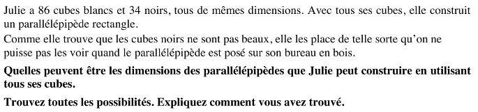 Trouver les dimensions possibles d'un parallélépipède rectangle constitué de 120 blocs cubiques (86 blancs et 34 noirs) de telle manière qu’on ne puisse pas voir les blocs noirs quand le parallélépipède est posé sur le sol.
