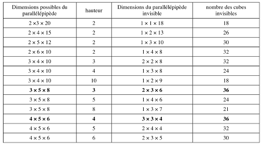 - Dresser un inventaire complet des parallélépipèdes possibles et calculer pour chacun le nombre des cubes invisibles en fonction de la hauteur choisie.