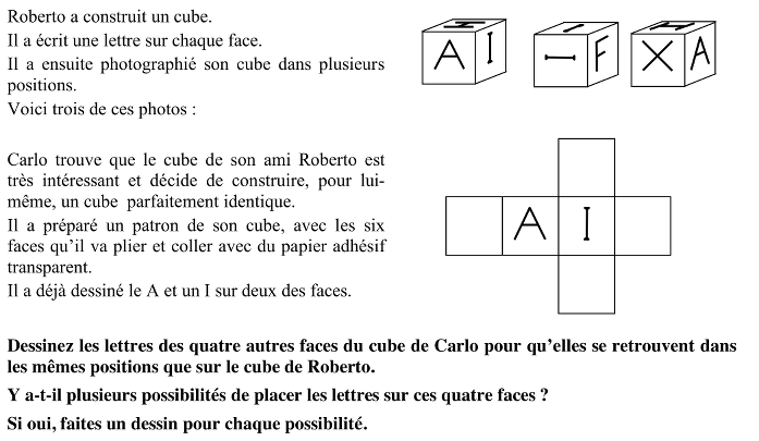 L’obstacle le plus fréquent relevé parmi les copies ayant obtenu de 1 à 3 points se situe dans la la correspondance entre les lettres F et I et les faces, puis dans leur orientation sur les faces. Comme le F n’a pas d’axe de symétrie, les erreurs perçues sont plus fréquentes car elle a quatre positions sur la face, alors qu’il n’y en a que deux « observables » pour le I.