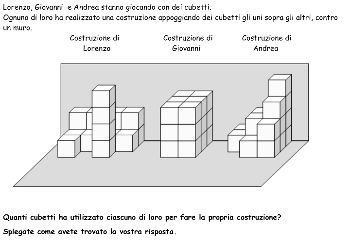 - Contare di quanti cubetti è composta ogni costruzione; il conteggio può avvenire sia contando i cubetti uno ad uno, sia utilizzando dei calcoli (costruzione di Lorenzo 3 x 4 + 4 + 1 = 17; quella di Giovanni 6 x 3 = 18; quella di Andrea 3 x 3 + 2 x 3 + 1 = 16) o calcoli similari.