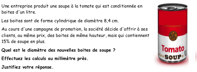 - Calculer l’aire de base des boites en promotion : V : $55.42 = (V \times 1.15) : x$ ; $x \approx 63.7$ ; puis le diamètre : $2 \times \sqrt{63.7}/\pi \approx 9,0$ cm
