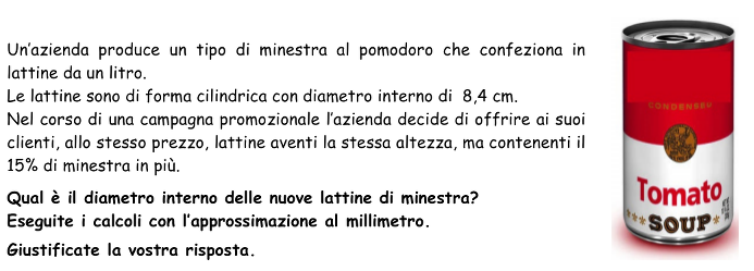 - Comprendere che il volume interno delle lattine preparate per la promozione è maggiore del 15% del volume delle lattine solitamente utilizzate, cioè è 1,15 litri oppure 1150 cmcm3.
