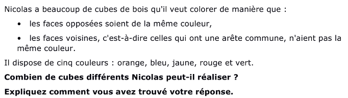 - Comprendre que trois couleurs sont nécessaires et suffisantes pour colorer un cube, étant donné qu’un cube a seulement trois paires de faces opposées et que des faces voisines doivent avoir des couleurs différentes. Comprendre que deux cubes colorés correctement sont différents s’ils diffèrent par au moins une couleur.