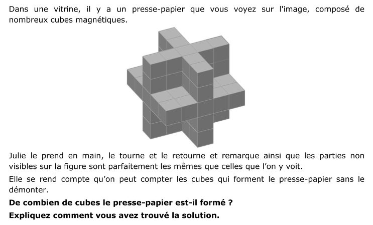 - Comprendre que le presse-papier est formé de cinq couches de cubes : quatre identiques en forme de croix et d’une couche centrale en forme de carré (si on admet que qu’il n’y a pas de vide à l’intérieur*).