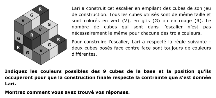 À partir d’un dessin en perspective d’un escalier construit avec 18 cubes de trois couleurs différentes (de 3 marches de trois cubes de largeur, dont on voit les trois rangs supérieurs et la « façade » de gauche) trouver la couleur des cubes non visibles, sachant que deux cubes ayant une face en commun sont toujours de couleurs différentes