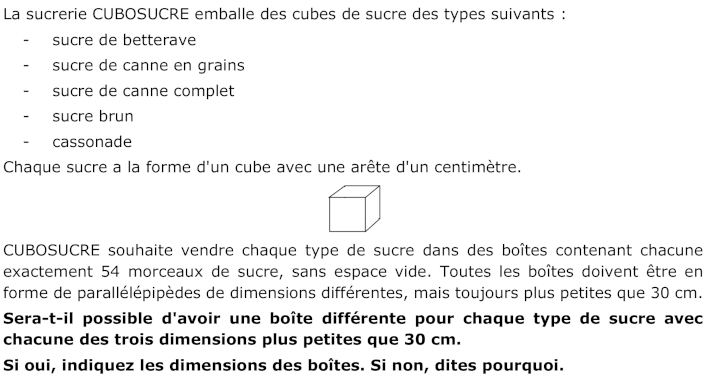Lee contexte des différents sucres, disposés en emballages différents est très artificiel et complexe. Il faut y renoncer et se limite à la tâche mathématique cérite plus haut: "Trouver les différentes décompositions de 54 en 3 facteurs qui sont des nombres naturels inférieurs à 30" ou, plus concrètement à la recherche des différents parallélépipèdes rectangles que l'on peut former avec 54 cubes égaux. Dans ces conditions le problème est d'un grand intérêt pour la géométrie dans l'espace et, en arithmétique, pour la multiplication et ses propriétés.