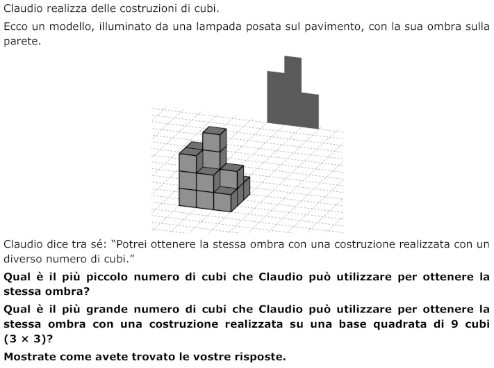 - Percepire l'oggetto, la costruzione nel nostro spazio tridimensionale e la sua ombra, in due dimensioni, e rendersi conto che quest’ombra può essere ottenuta da diverse sovrapposizioni di cubi costruiti su una base di 3 × 3.