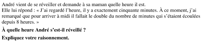- Remarquer que de 8 h à midi, il se passe 4 h ou 240 minutes et en déduire qu’il y a 80 = 240 : 3 minutes entre 8h et « R – 50 », puis 80 + 50 = 130 (minutes) entre 8h et le moment du réveil « R ». C’est-à-dire qu’André s’est réveillé à 10h10.