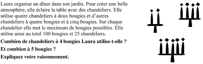 Trouver la décomposition de 100 en somme de 25 termes : 4 termes « 2 » et 21 autres termes « 4 » ou « 5 », dans un contexte de chandeliers et bougies. Ou résoudre un système de deux équations du premier degré à deux inconnues: 100 = 8 + 4a + 5b  et a + b = 21.