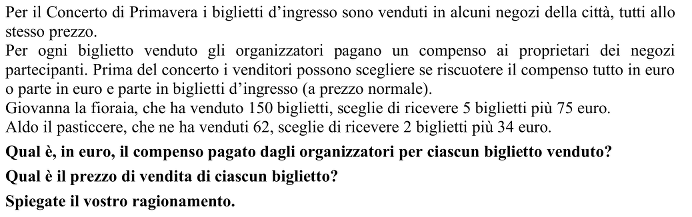 In una situazione di ripartizione di compensi, proporzionali a 150 e 62 biglietti venduti, sotto forma di un importo in euro e di biglietti, trovare il compenso per biglietto venduto e il prezzo di vendita di un biglietto, sapendo che per 150 biglietti venduti si ricevono 75 euro e 5 biglietti e per 62 biglietti venduti, 34 euro e 2 biglietti.