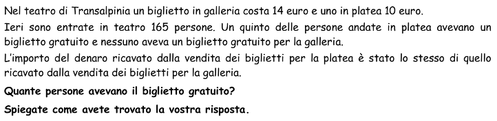- Procedere quindi per tentativi organizzati: ipotizzando uno stesso ricavato per i biglietti della galleria e della platea, determinare il numero degli spettatori nelle due zone, il numero degli spettatori non paganti e poi controllando se la somma di tutti gli spettatori è 165. Per esempio se il ricavato è di 560 euro sia per la galleria che per la platea, gli spettatori per la galleria sono 40 (560:14), quelli paganti della platea sono 56 (560:10) e che i non paganti sono 14 (56 :4), ma 40+56+14=110, occorre quindi scegliere un valore maggiore. Scelto 840 euro come ricavo comune, gli spettatori della galleria sono 60, quelli paganti della platea sono 84, quelli non paganti 21; verificare che 60+84+21= 165.