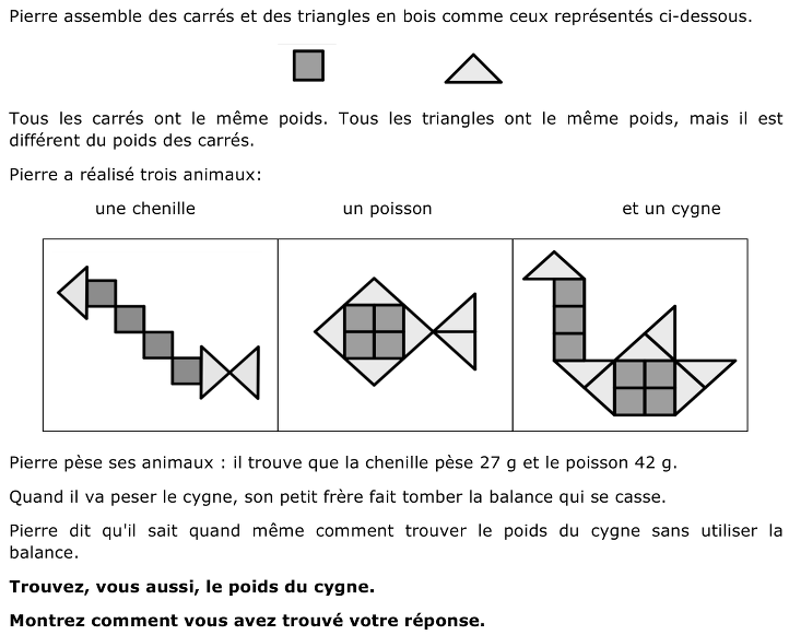 − Connaissant le poids d’un triangle, trouver celui d’un carré. Par exemple en utilisant la « chenille ». Quatre carrés pèsent 12 g (27 – 15) ; par conséquent un carré pèse 3 g (12 : 4) .