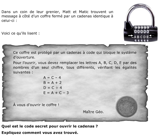 * C = 4 alors A vaut 0 (C – 4), B = 2, D = 1 et E = 1, ce qui donne le code 02411 inacceptable car il ne respecte pas la contrainte « nombres tous différents ». * C = 8 alors D vaut 2, A vaut 4, B vaut 6, E vaut 9 (8 = E – 4 + 3) ce qui donne le code 46829 qui respecte toutes les conditions.