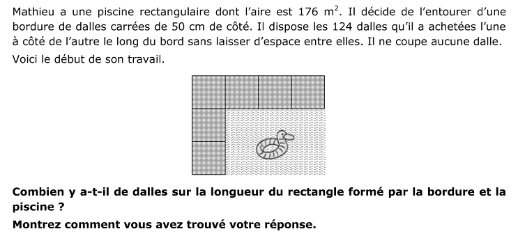 - Procéder comme précédemment mais en effectuant une recherche systématique qui, éventuellement, n’exclut pas la possibilité de nombres impairs de dalles par côté. Par exemple : considérer tous les couples de nombres compatibles avec les dimensions des dalles dont le produit est égal à 176 : 0,5 × 352 ; 1 × 176 ; 2 × 88 ; 4 × 44 ; 5,5 × 32 ; 8 × 22 ; 11 × 16 et vérifier si pour chacun des couples trouvés le nombre correspondant de carrés de 0,5 m de côté est égal à 124. Par exemple pour (0,5 ; 352) : (0,5 : 0,5 + 352 : 0,5) x 2 + 4 = 1414. Trouver que le seul couple solution est (8 ; 22) et que par conséquent il y a 22 : 0,5 + 2 = 46 dalles sur la longueur.