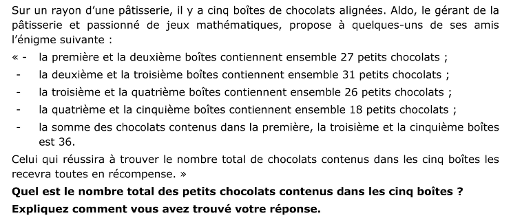 De la première et deuxième données, déduire que la troisième boîte contient 4 chocolats de plus que la première, puis de la troisième et quatrième données que la cinquième boîte en contient 8 de moins que la troisième et que par conséquent si x est le nombre de chocolats de la première boîte, la troisième en contient x + 4 et la cinquième x + 4 – 8 = x – 4 ; puis, selon la dernière donnée x + x + 4 + x – 4 = 36 d’où 3x = 36 et finalement x = 12, nombre de chocolats de la première boîte. Déduire alors successivement le nombre de chocolats de la deuxième boîte (15), de la troisième (16), de la quatrième (10), et de la cinquième (8).