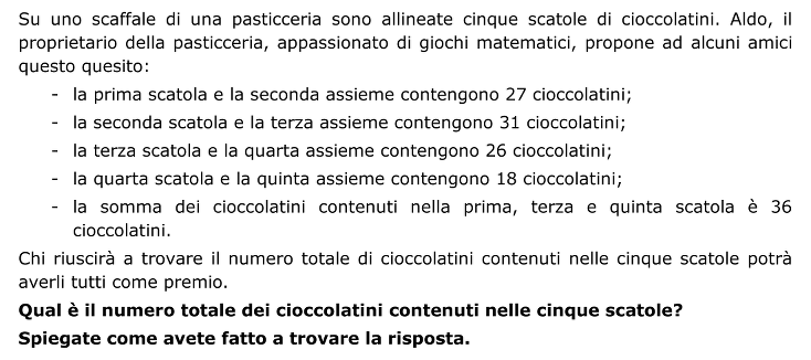 - Dalla prima e dalla seconda indicazione dedurre che la terza scatola contiene 4 cioccolatini in più della prima, poi dalla terza e quarta indicazione dedurre che la quinta scatola contiene 8 cioccolatini in meno della terza e che quindi se x è il numero di cioccolatini della prima scatola, la terza ne contiene x + 4 e la quinta x + 4 − 8 = x − 4; in base all’ultima indicazione si ha quindi x + x + 4 + x − 4 = 36 da cui 3x = 36 ed infine x = 12, numero di cioccolatini della prima scatola. Dedurre quindi il numero di cioccolatini della seconda scatola (15) della terza (16), della quarta (10) e della quinta (8).