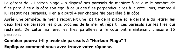 en notant n le nombre de files de la disposition initiale et donc (n + 4) le nombre initial de parasols par file et (n - 2) le nombre final de files, poser l'équation du second degré n(n + 4) = 16(n – 2). Trouver les deux solutions n = 4 et n = 8.