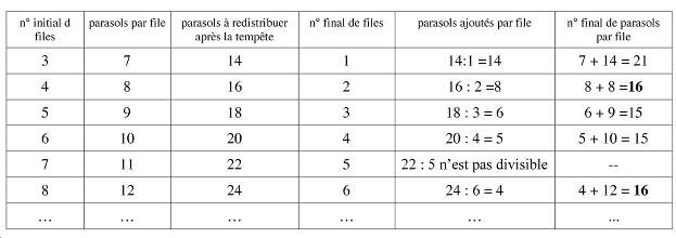 - Procéder par essais du nombre initial de files, en contrôlant que le nombre de parasols à redistribuer après la tempête soit divisible par le nouveau nombre de files et vérifier que le nombre final de parasols par file soit 16. Pour aider les correcteurs voici un tableau possible :