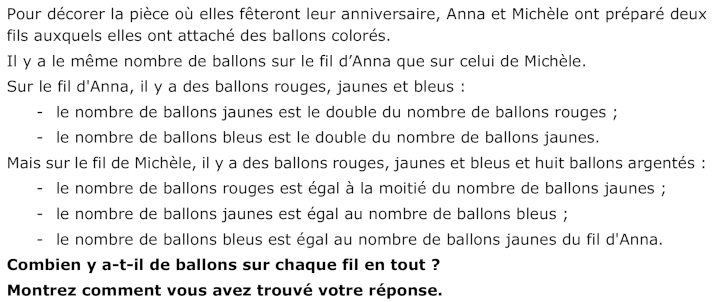 - Procéder par tâtonnements (vu le grand nombre de relations on ne peut envisager que cette procédure) : choisir une grandeur à essayer (par exemple, le nombre de ballons rouges du fil d’Anna, et calculer progressivement les nombres de fils des autres couleurs en suivant les informations de l’énoncé.
