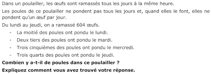 Comprendre que les fractions données, « la moitié », « les deux tiers », "trois cinquièmes" et "trois quarts" se rapportent chacune au nombre total des poules qui est encore indéterminé et sera l'objet de la question. Ces fractions vont permettre de calculer le nombre d'oeufs pondus chaque jour, qui additionnés, donneront les 604 œufs pondus en quatre jours. Ceci devrait permettre de passer du poulailler, des poules et des oeufs à une relation entre nombre qui se traduit: «Quel est le nombre dont la moitié, les deux tiers, les trois cinquièmes et les trois quarts additionnés est 604.