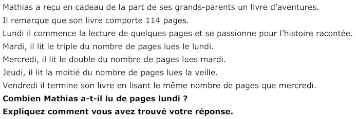 Comprendre que le livre est composé de 114 pages, que Mathias le lit en entier en cinq jours et que le nombre de pages lues chaque jour dépend directement du mobre de pages lues le lundi.