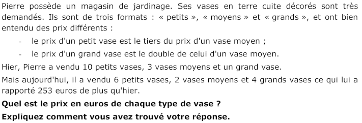 - Les calculs peuvent s’effectuer par la « traduction » mot à mot de la comparaison des prix des deux jours : « hier » 6 petits, 2moyens, 4 grands et « aujourd’hui » 10 petits, 3 moyens, 1 grand, augmentée de 253 ; puis par les substitutions nécessaires pour exprimer la comparaison en prix des petits vases :