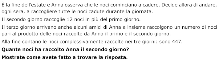 Il compito di appropriazione consiste nel prendere in considerazione i dati dell'enunciato: un primo numero ancora indeterminato, un secondo che vale 12 in più del primo, un terzo che è il prodotto del primo e del secondo e la somma dei tre, pari a 447.