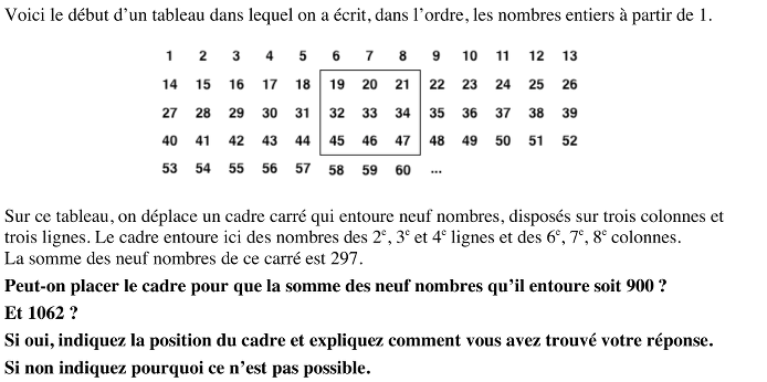 - Conclure que la somme de 900 s’obtient avec le cadre sur les lignes 7, 8, 9 sur les colonnes 8, 9, 10, et qu’il n’est pas possible d’obtenir une somme de 1062 car 118 est sur la première colonne et un cadre centré sur 118 n’entourerait pas 9 nombres.