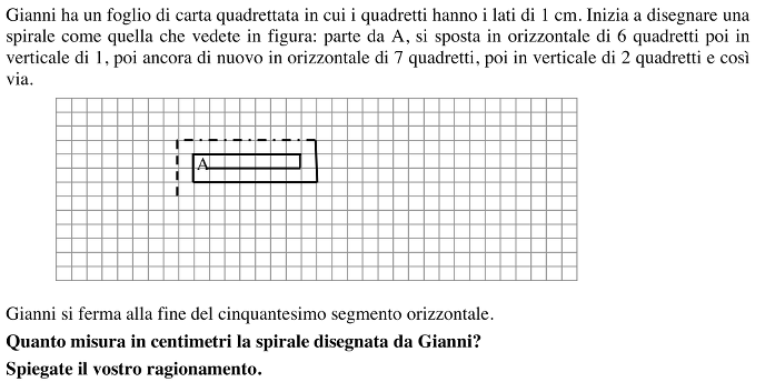 - Esprimere la lunghezza totale della spirale oppure rendersi conto che è la somma di due progressioni aritmetiche: (6 + 1 + 7 ... 54 + 55) + (1 + 2 + 3 + … + 48 + 49) ed effettuare le addizioni con una calcolatrice (rischiando notevoli possibilità di errore anche con la calcolatrice).