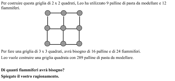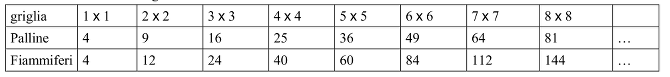Oppure notare che (vedi tabella) se la griglia è composta da i x i quadrati le palline sono (i+1)(i+1) e i fiammiferi sono 2i(i+1)