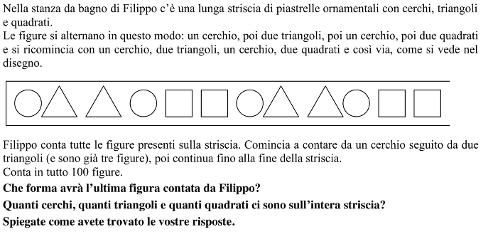 Osservare l'inizio di una sequenza di 100 figure, scoprire la sua periodicità (6 elementi: un cerchio, due triangoli, un cerchio, due quadrati) determinare la centesima figura e trovare il numero di ogni tipo di figura nella sequenza.
