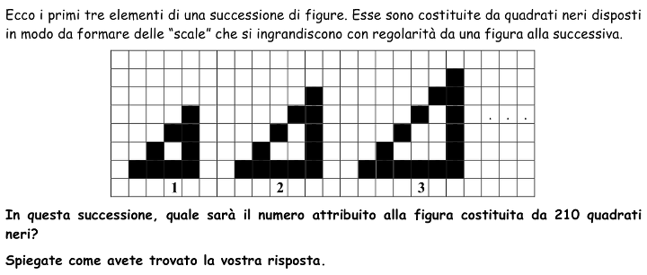 Oppure, osservare che se n è il numero di una figura della successione, ci sono n + 3 cubetti neri sul lato orizzontale di tale figura, n + 2 sul lato verticale e infine n + 1 sul lato obliquo, cioè in tutto 3n + 6. Dedurne che n = 68 calcolando (210−6) / 3.